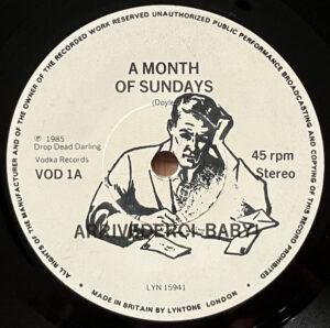 After the last post, it seems I’ve been slacking a bit. Let’s change that. To get back into the swing of things, here’s a quick 2-track 7” from Arrevederci Baby! a post-punk/indie rock hybrid band from the UK who released this one 7” single released on Vodka Records (cheers!) in 1985. This project featured, among other unnamed members, Bernie Doyle, who was previously in Self Control. Another member is named Kaye, judging from the autograph on my own copy, but not sure if the band featured more Self Control members or just Doyle.